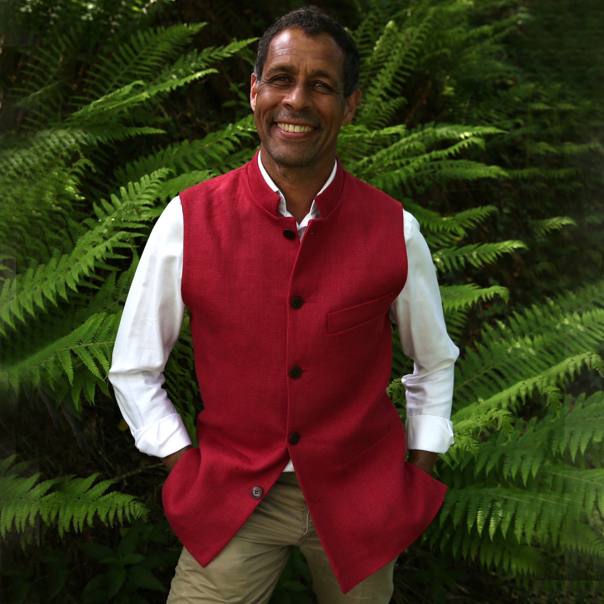 A Classic Cut waistcoat with a Nehru collar in a wonderfully weighty pure linen in a superb deep red in a size 40." The colour will make a splash wherever you go.