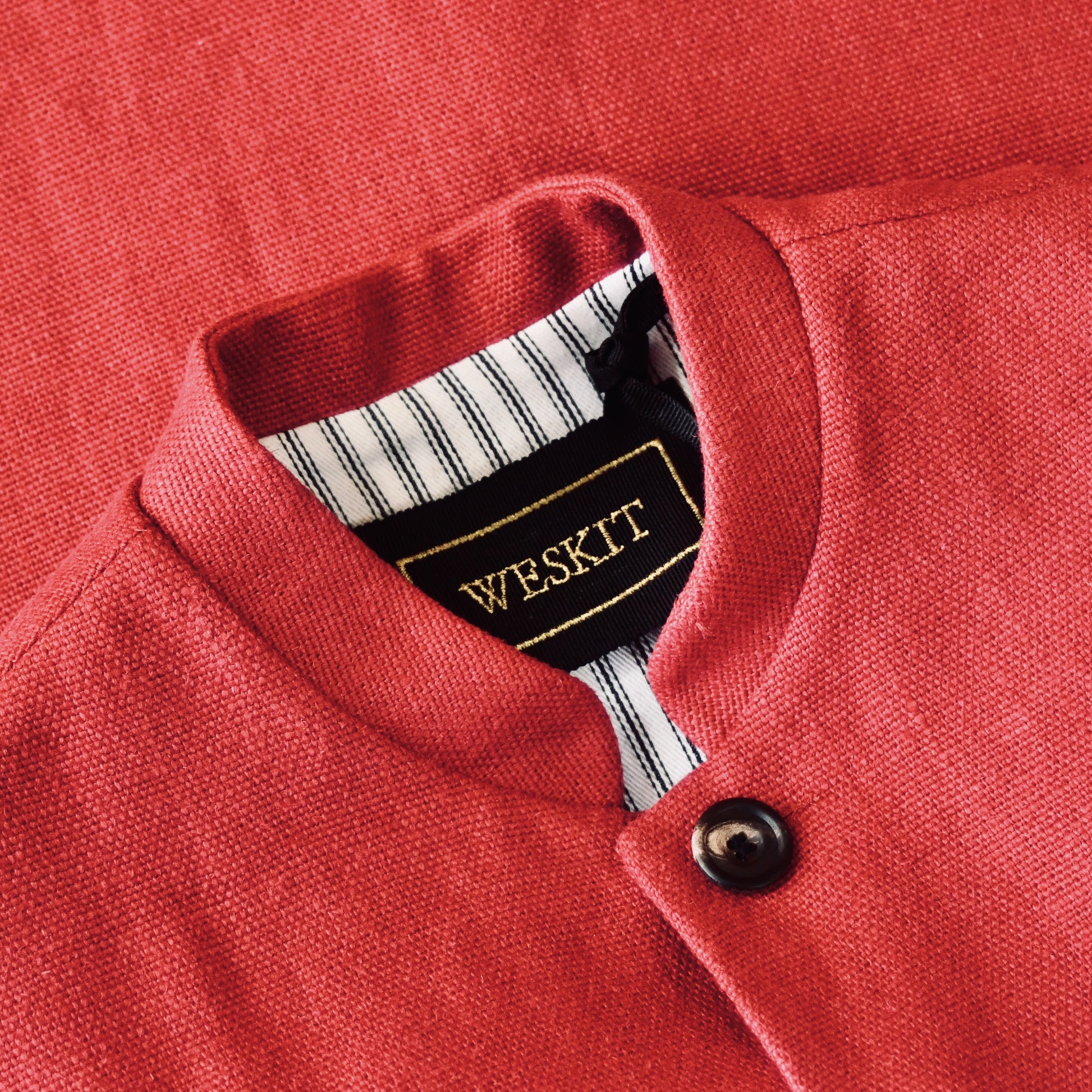A Tailored Cut waistcoat with a Nehru collar in a wonderfully weighty pure linen in a superb deep red in a size 44." The colour will make a splash wherever you go.