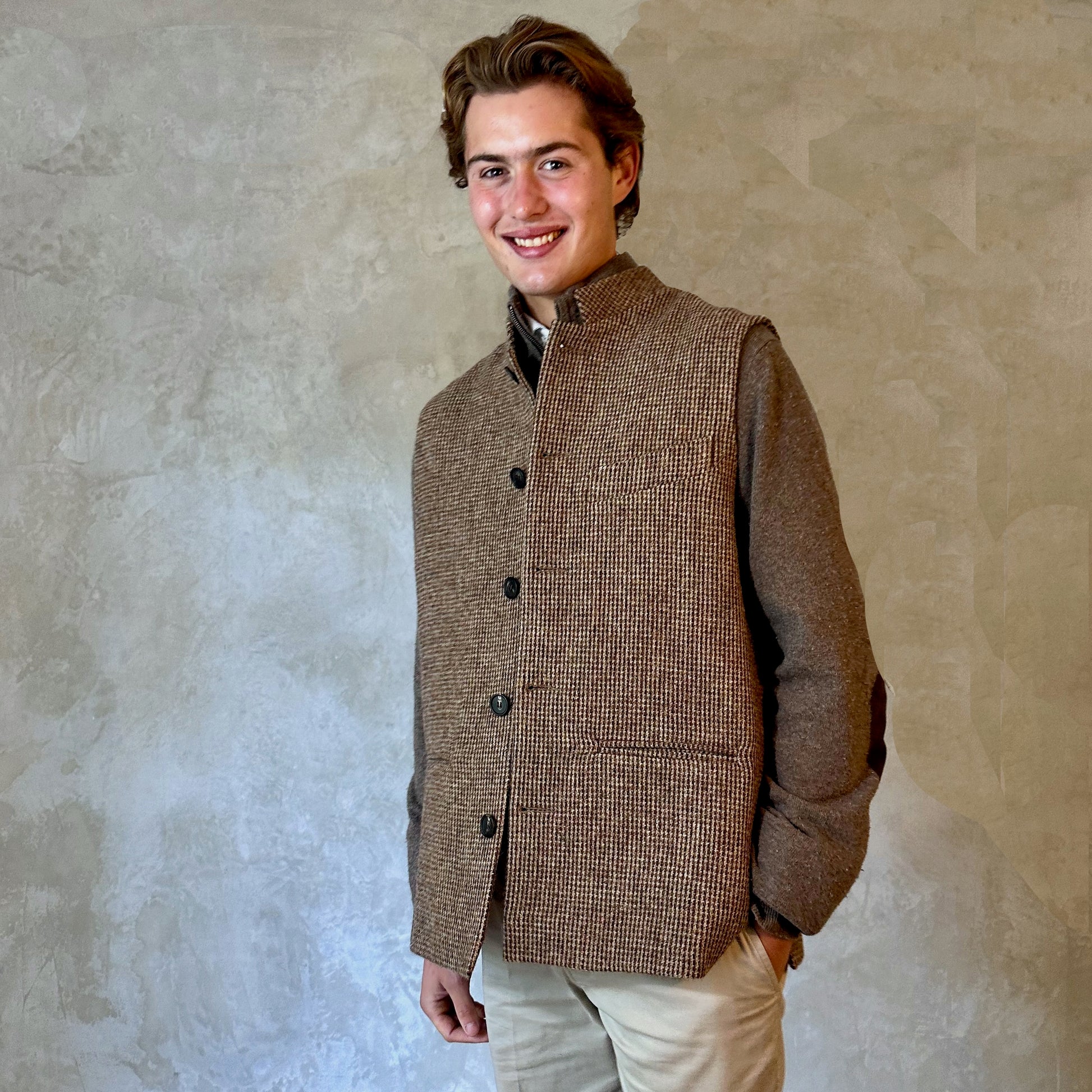 A Classic Cut waistcoat in a wonderful warm-weight tweed from Lovat Mill. A subtle small check patterning in shades of camel and brown that will easily co-ordinate.