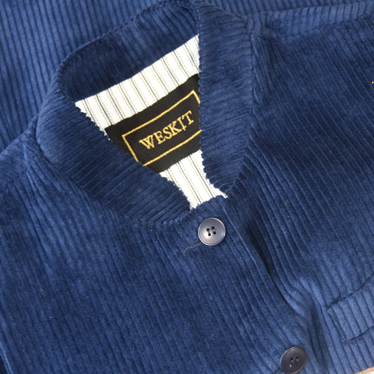 The photographs show this outer made up in a Ladies Longer Length Cut waistcoat. The waistcoat shown has a Mandarin collar and Blue Corozo buttons.