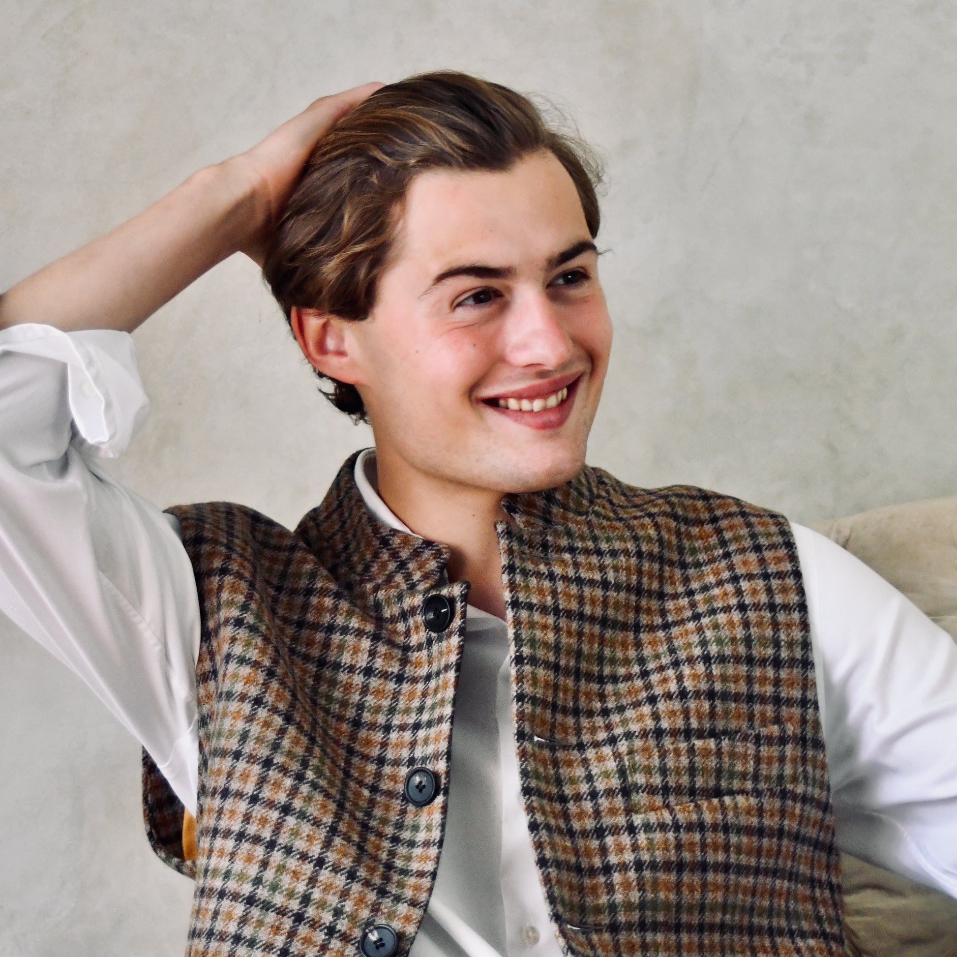 A Classic Cut waistcoat in a limited edition tweed from Fox Brothers. This is a superbly fine tweed that will surprise you. Worth every penny, it will take you everywhere, smartly. A smokey brown and dull green weave a stunning check against a warm hued background, creating an unusual and bold check that will hold its own anywhere.
