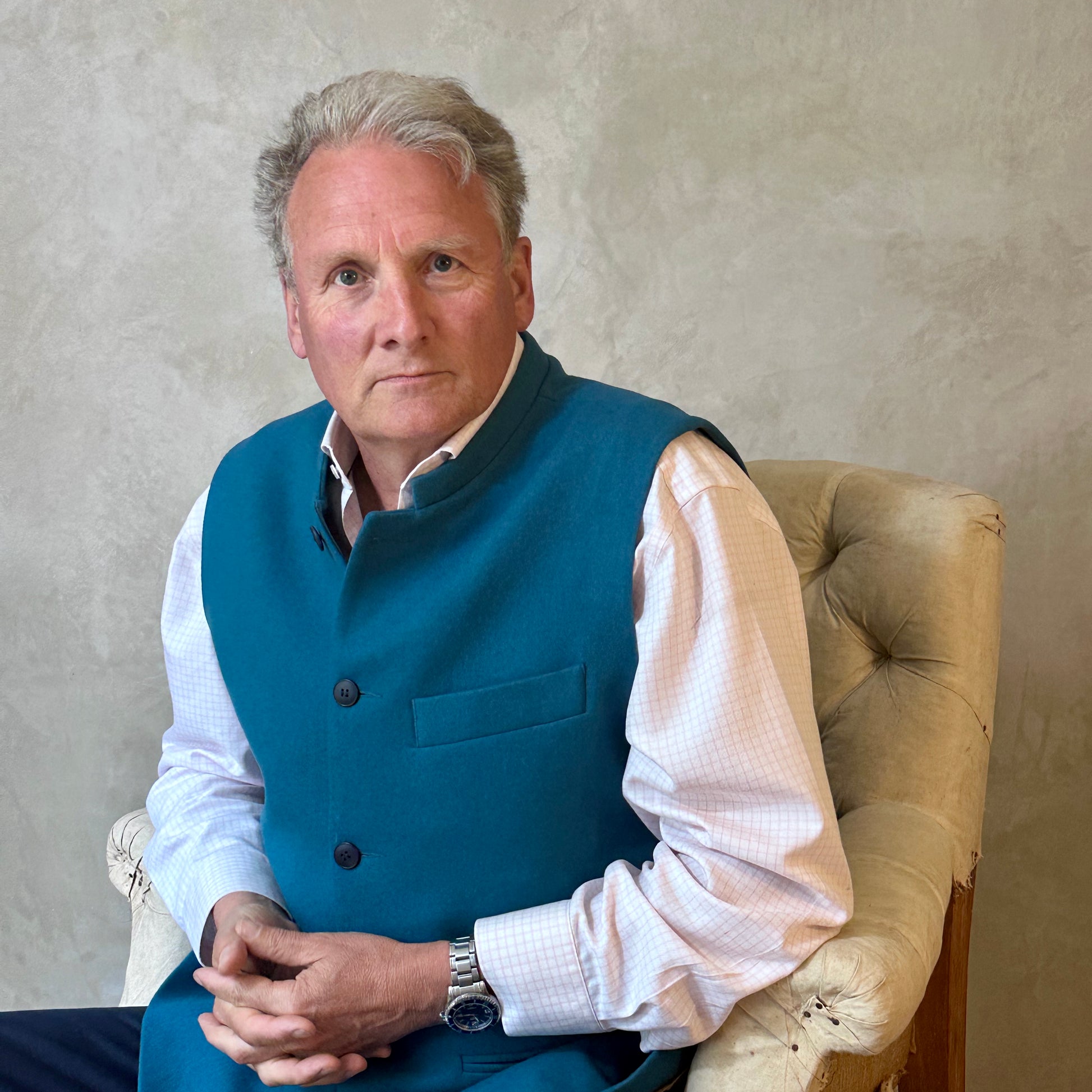 A Tailored Cut waistcoat in size 46" in a gorgeous and unusual blue Melton by AW Hainsworth. A warmer weight textile, this pure merino flannel has a magnificent handle and a superb colouring.