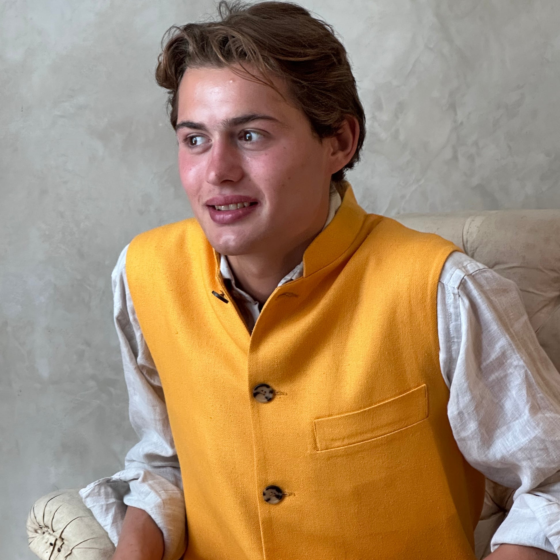 The photographs show a Tailored Cut Waistcoat with a Mandarin collar made up in Sunflower Yellow Silk Matka. We have used a Cotton Ticking lining and Dark Cornu buttons.