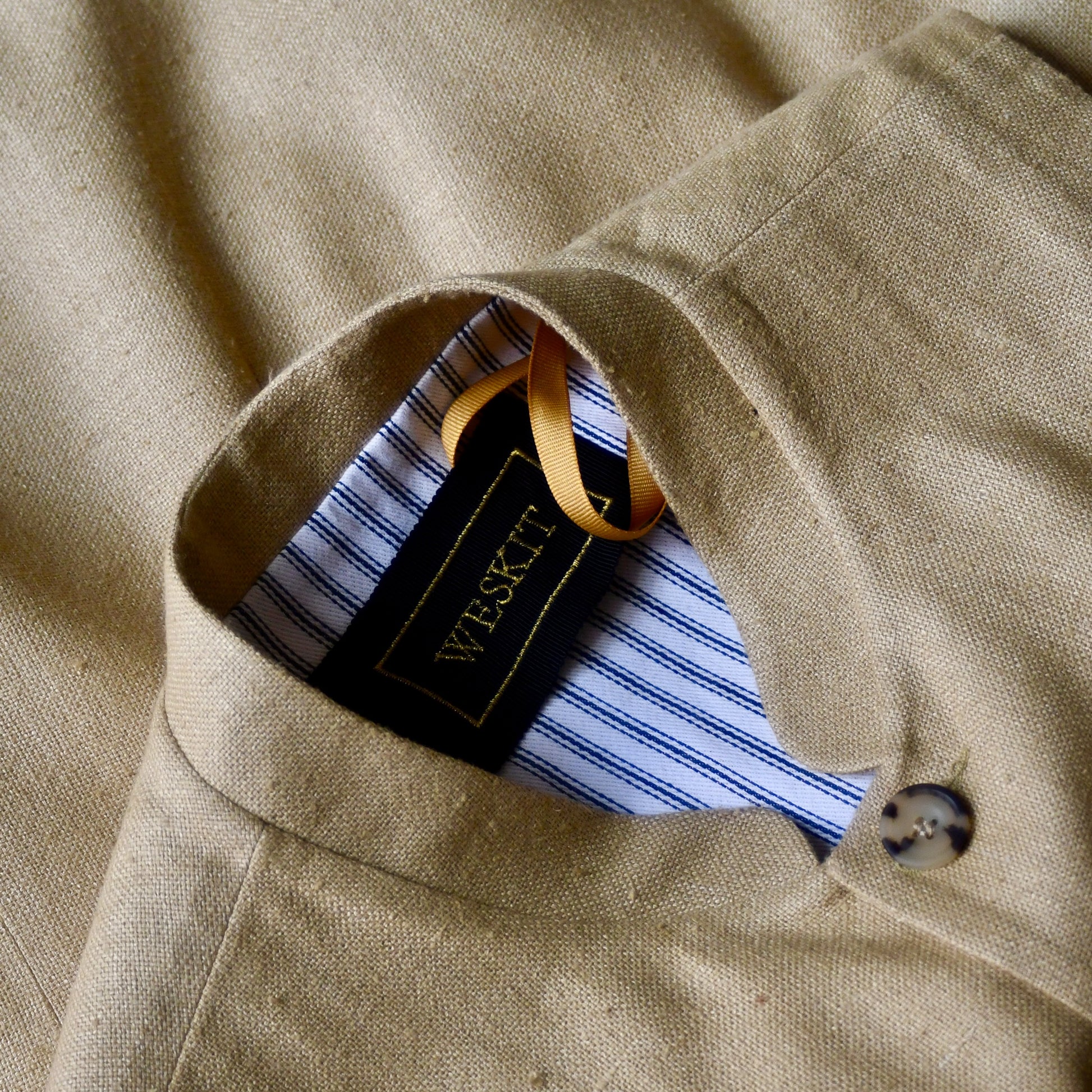 The waistcoat is lined in pure cotton ticking. Outside we have used a Brown Corozo button.