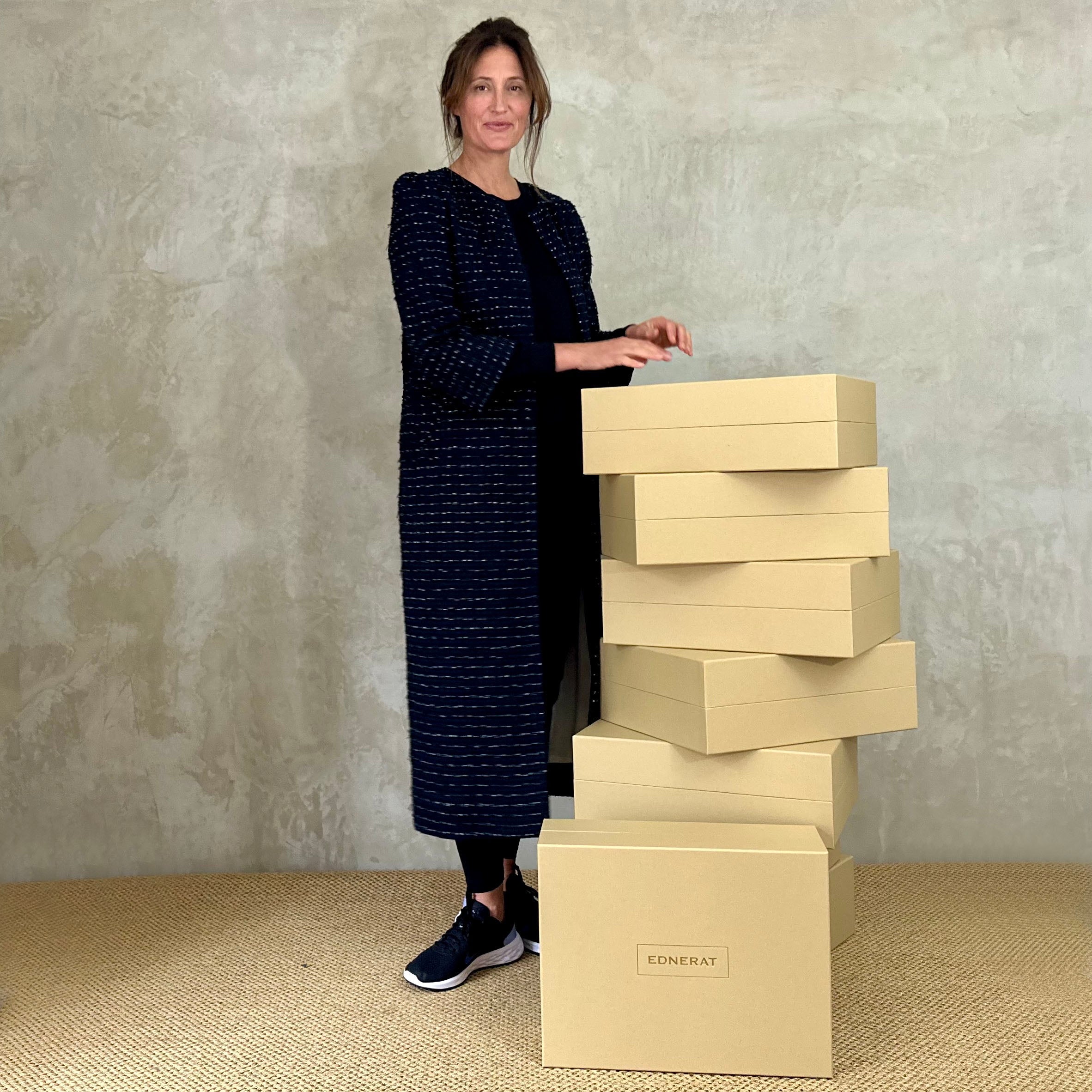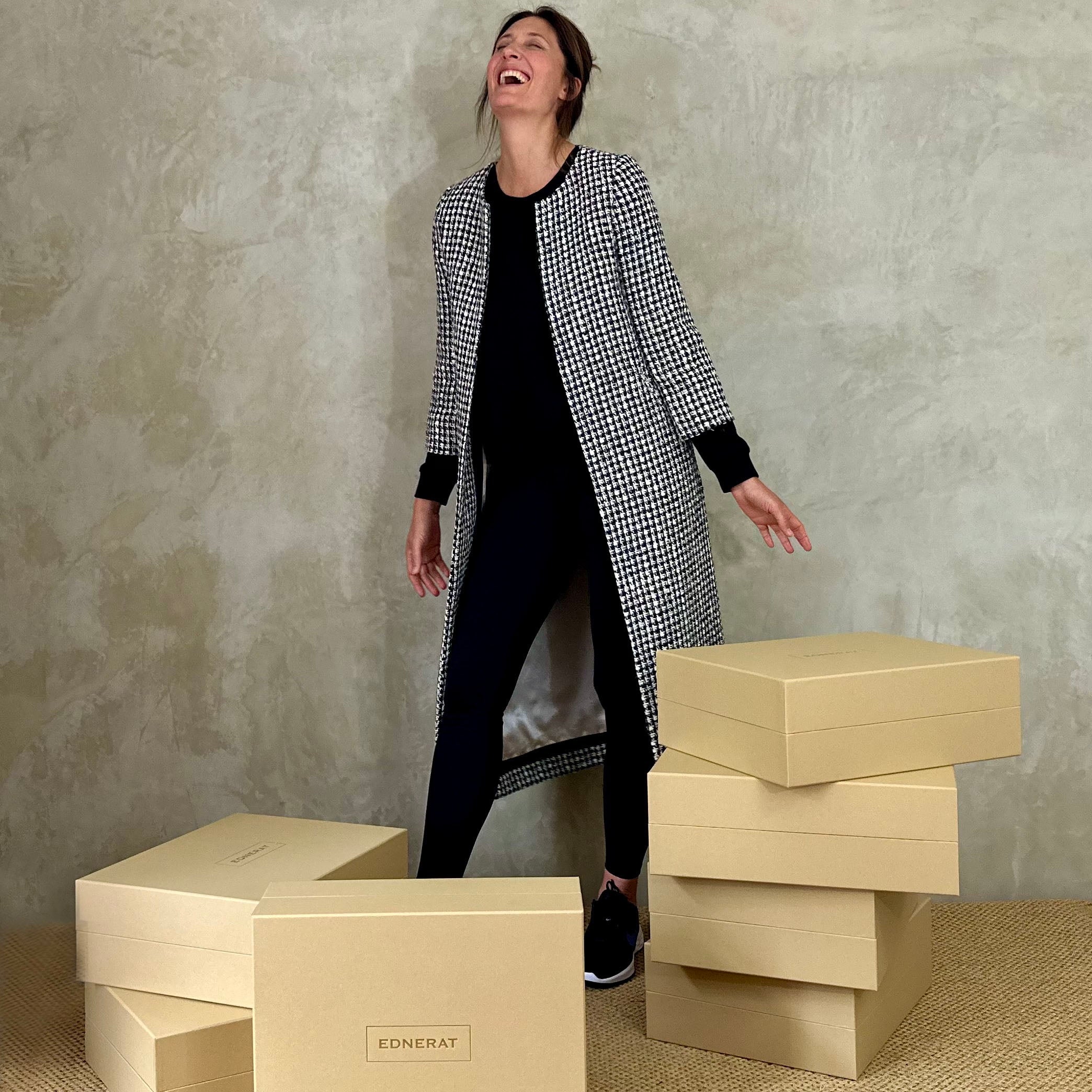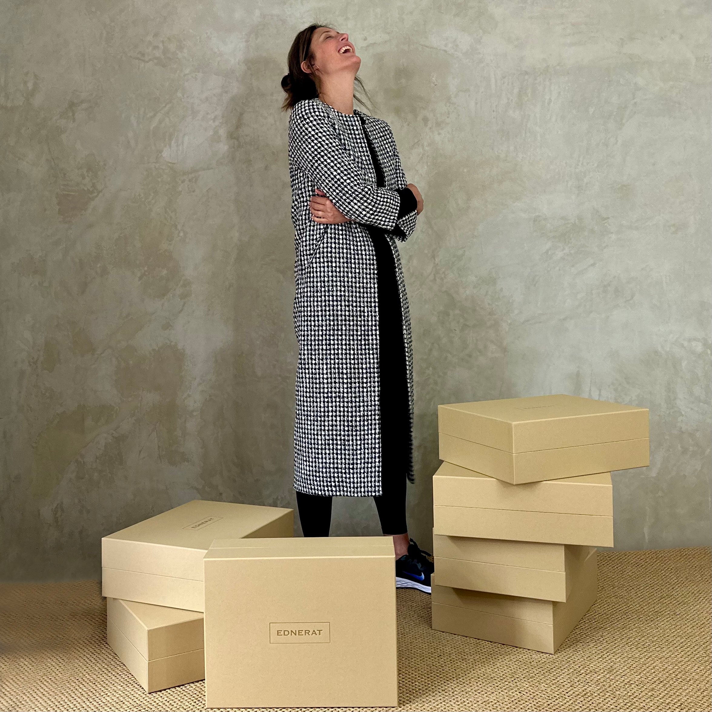 We ship our coats carefully wrapped in re-cycled Kraft tissue paper. The tissue helps prevent the coats from creasing too much and is worth holding onto for travelling or to shape shoes, boots and handbags. Once wrapped in the tissue, our coats are packed in beautiful hand-crafted boxes covered in re-cycled Kraft paper. Our boxes are made for us by MacCarthy & Sons, a wonderful fifth-generation family business in Woolwich using traditional box-making techniques. We hope you will hold on to your box and find a good use for it; if you don’t have room for it, you can always compost it – but ideally, please let us know. We will cover the return postage and use your box for storage.