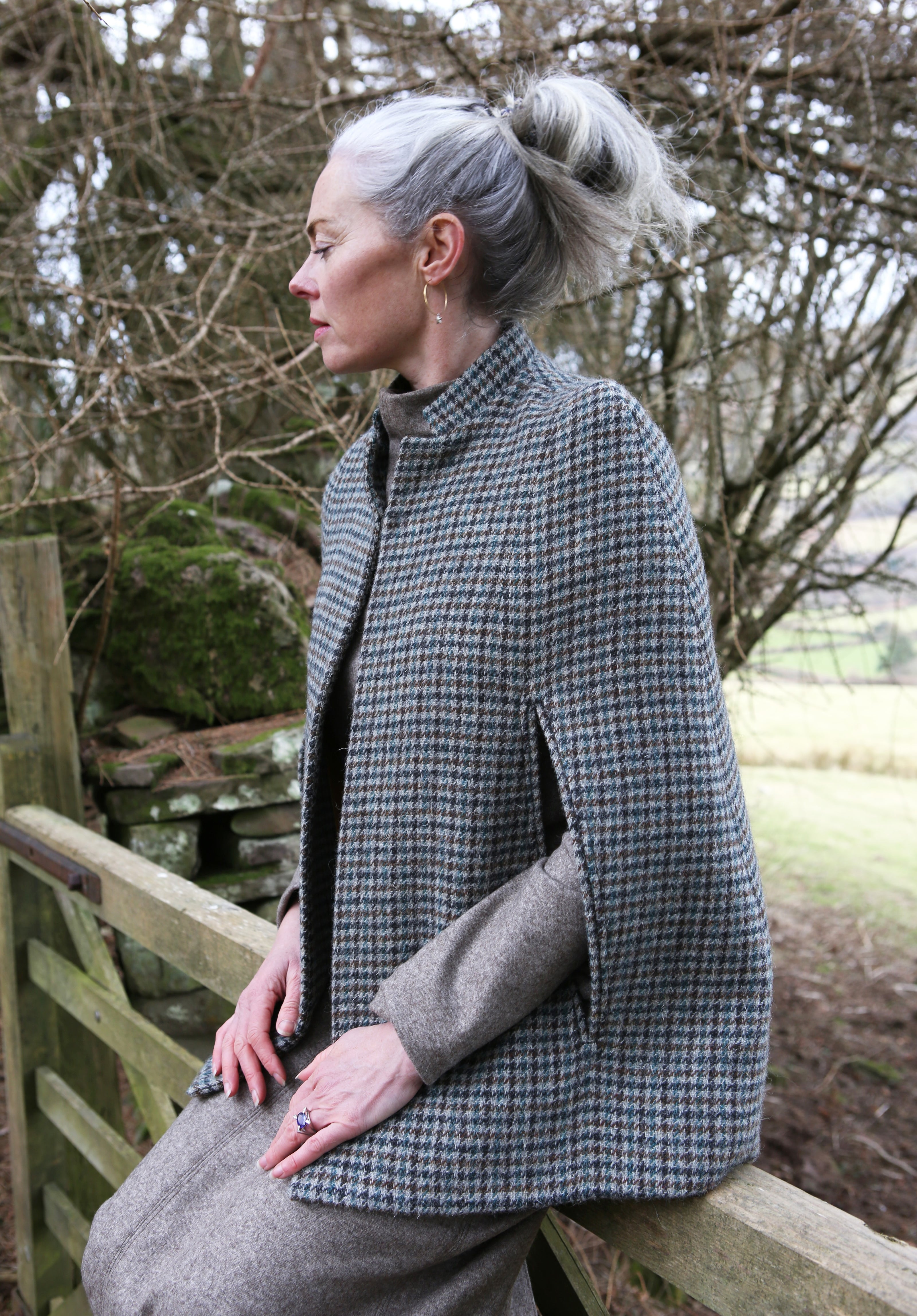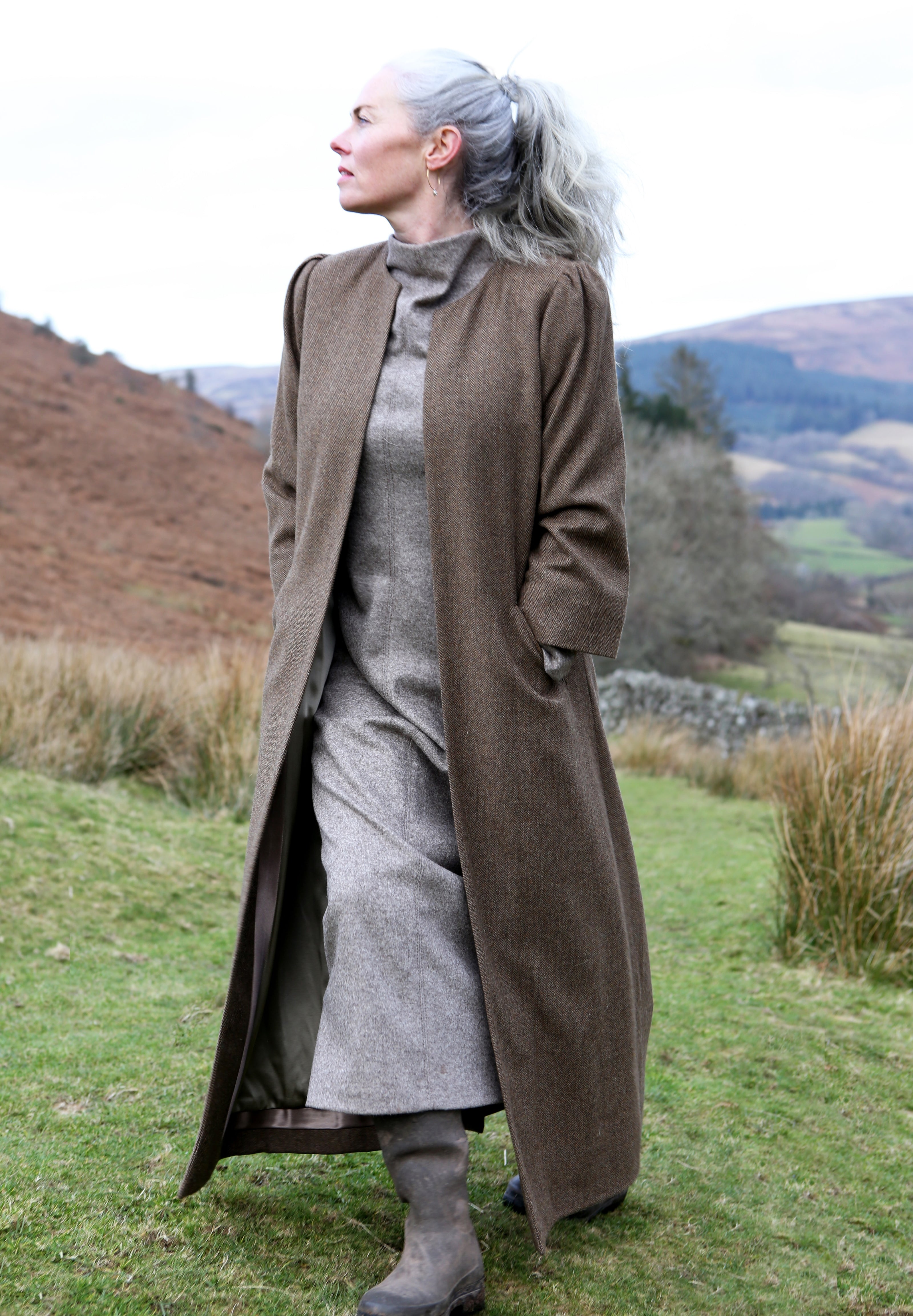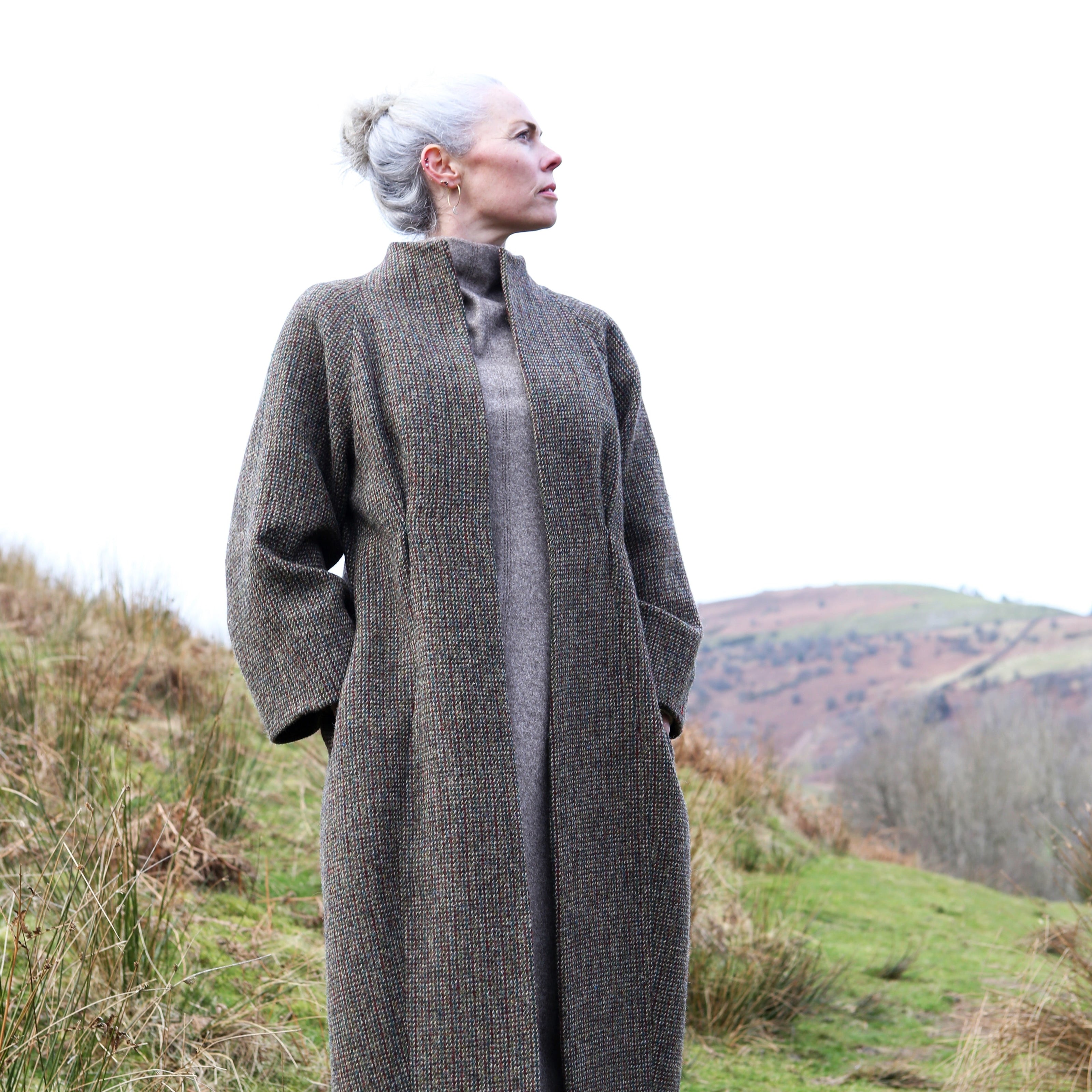 The Long Frink in Dark Check Lovat Tweed