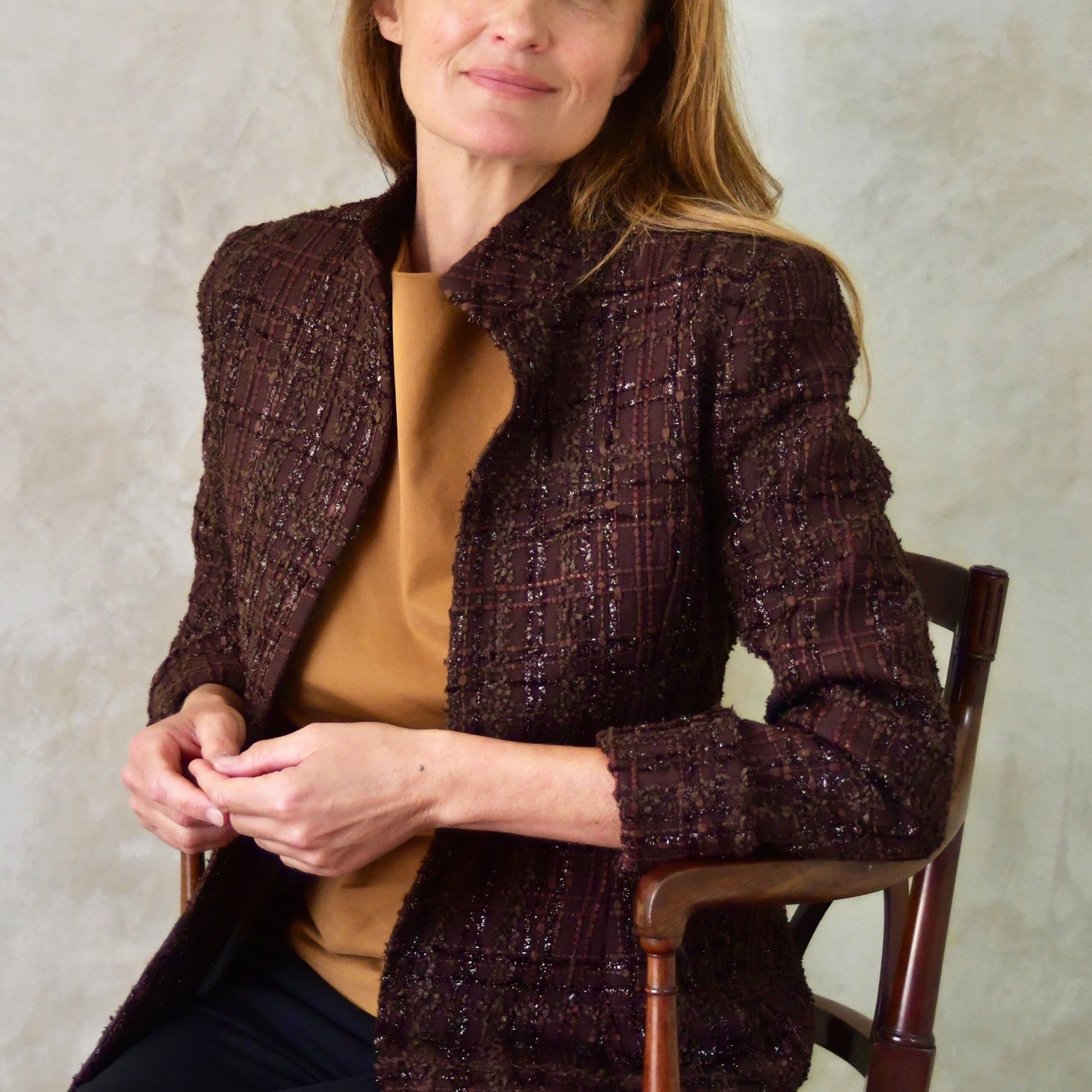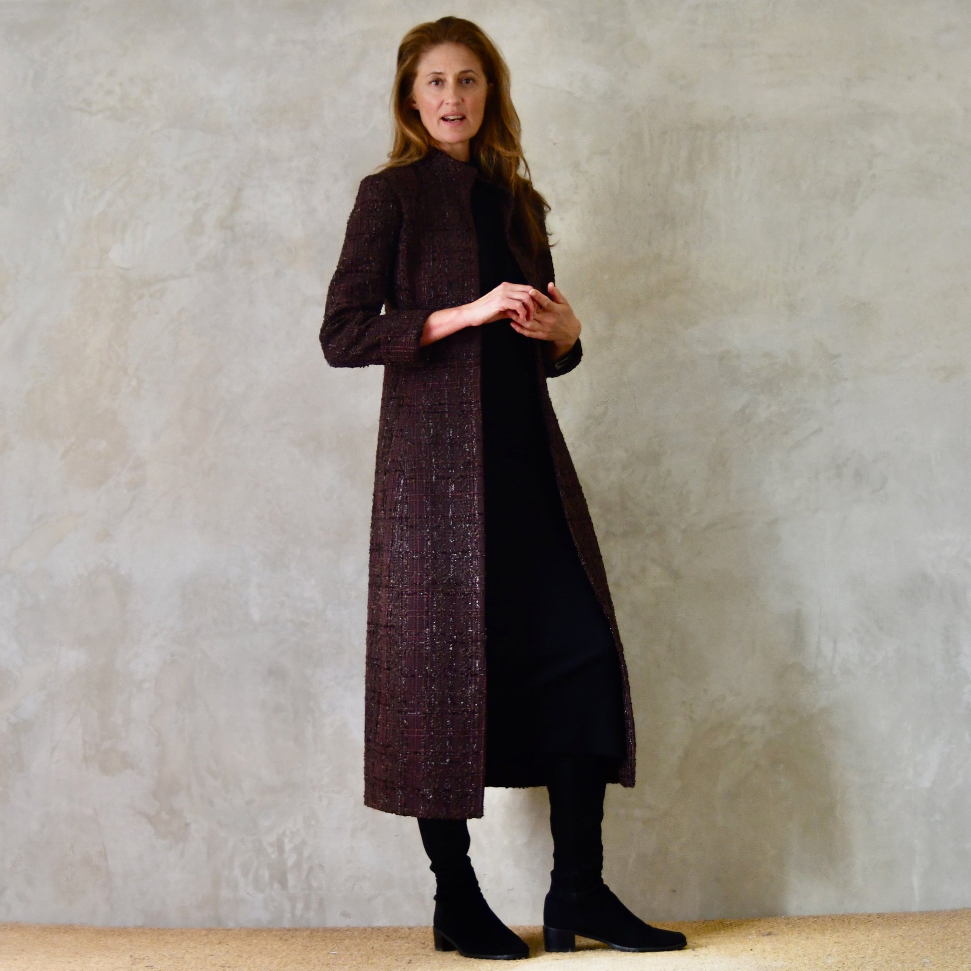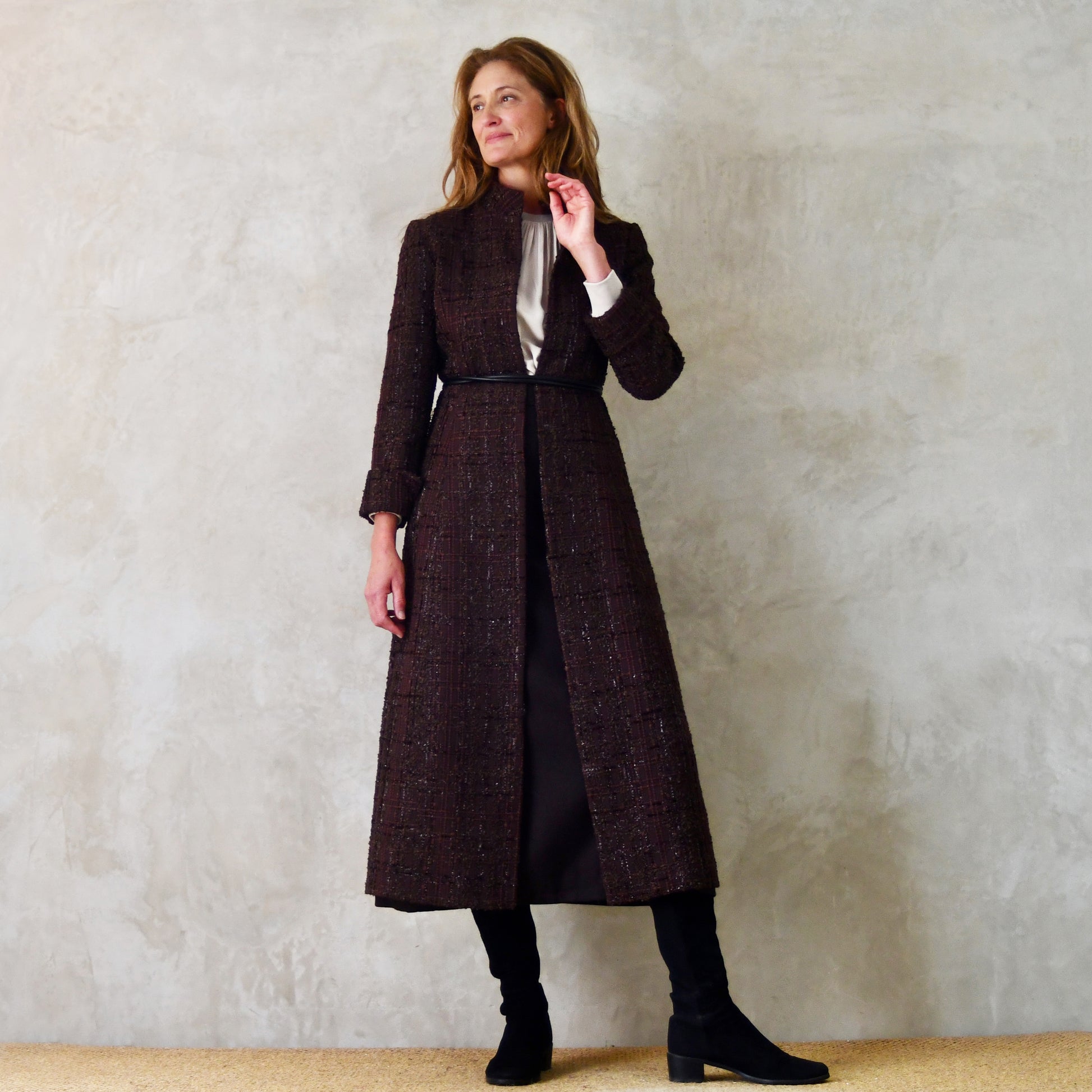An hourglass shaped coat in a truly smart limited edition dark chocolate boucle woven in Carlisle. Hugely versatile, this coat will take you to work, races, dinner, weddings and beyond.
